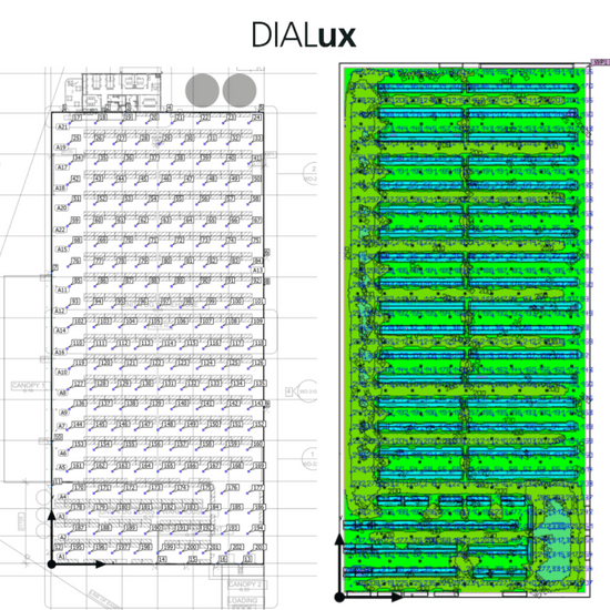 Using your site drawing plans, we can plot the lights and draw a coverage area via the spread of lux levels, from the lights.